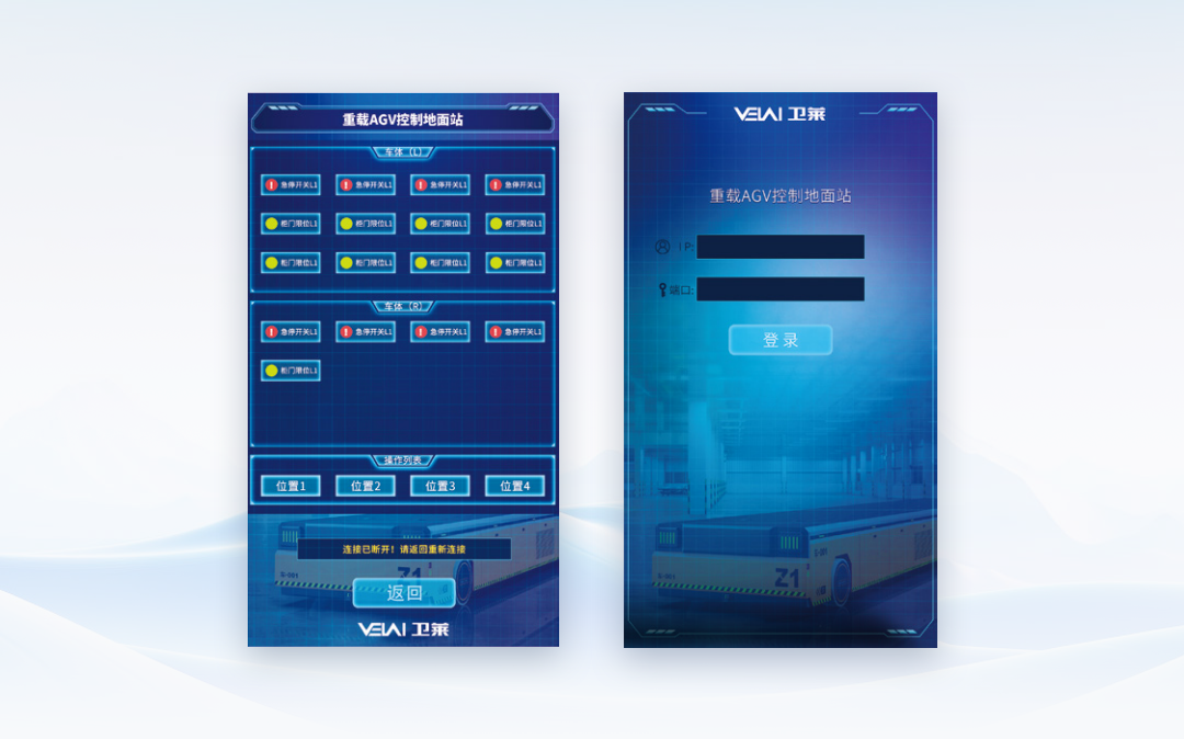 重載AGV控制地面站(手持終端)是一款為重載AGV量身定 制的便攜式移動終端,實現(xiàn)對重載AGV狀態(tài)監(jiān)控、運(yùn)動控 制、任務(wù)調(diào)度等功能,工作人員通過終端在APP操作重載 AGV進(jìn)行移動、急停、到指定位置等功能。